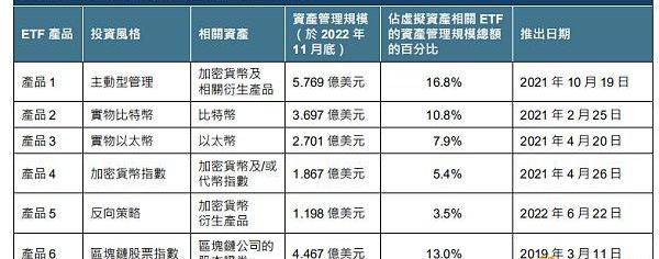 于2022年11月底,加拿大、巴西、美國及澳洲多個市場共有40只虛擬資產ETF,涉及資產管理規模總額達24億美元;