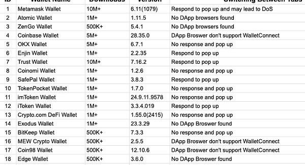 4.部分錢包App如ExodusWallet和EdgeWallet在連接測試環境下未找到相關的DApp進行測試,無法判斷其切換界面后的響應情況。