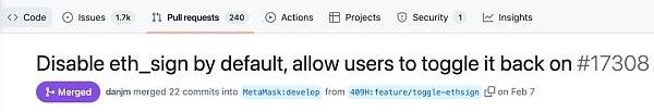 不過如果只是禁用了eth_sign也不是完全沒有風險,我們還是呼吁更多的錢包開始禁用它。以用戶數量最多的MetaMask錢包為例,其插件端已經在2023年2月10號發布的V10.25.0版本默認禁用eth_sign,而移動端也在2023年3月1號發布的版本號為6.11開始默認不支持eth_sign,用戶需要到設置里手動打開才能使用它。