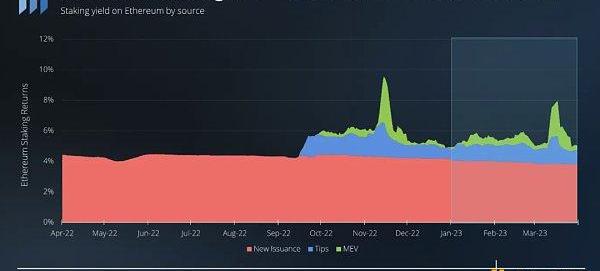 季度年化驗證者收益率為5.6%,略低于上季度的6%。收益的主要部分來自新增產出,占6%的3.9%。交易小費和MEV支付分別貢獻了1.1%和0.6%的質押收益。