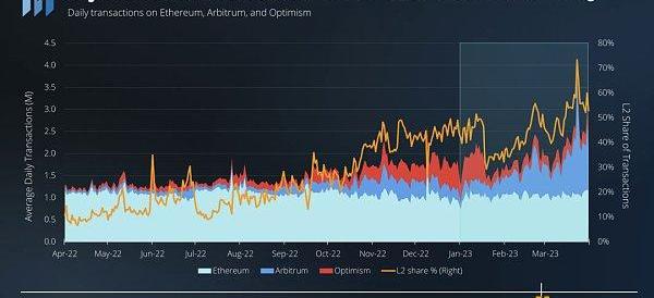 DeFi活動的下降可能是由于以太坊Layer-2的作用日益增大。自L2推出以來,其交易份額每個季度都在穩步增長。2023年第一季度,L2占交易份額從2022年第四季度的38%增加到2023年第一季度的45%。由于Optimism的激勵計劃在1月份結束,L2份額有所下降,但隨著Arbitrum交易的增長,它在本季度后期恢復了增長。在ARB代幣發布當天,L2份額創下了73%的歷史最高水平。