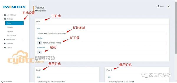 再進入“Settings/Pools”頁面下配置好礦池地址、礦工號和密碼,然后點擊下側“Update Pools”保存更新礦池就完成了,需要注意的一點是配置礦池時須將礦池地址前綴 stratum+tcp:// 完整的加上,否則無法保存更新。