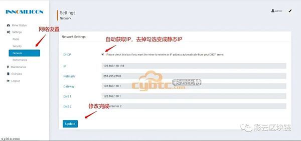 在“Settings/Network”頁面下可將 A10 Pro 礦機IP地址更改為靜態IP地址方便維護。