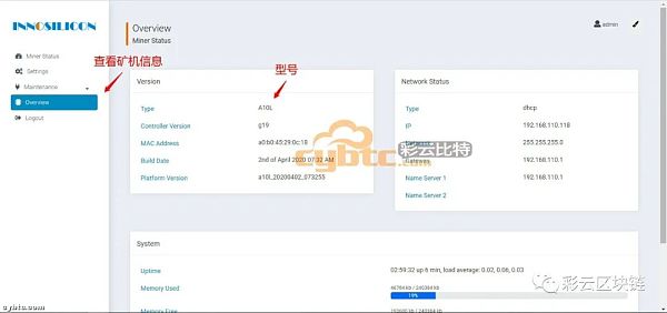 在“Overview”頁面下可查看 A10 Pro 礦機的系統信息,Type 為 A10L 即為 A10 Pro 5G 顯存版本,可查看礦機固件版本信息等。