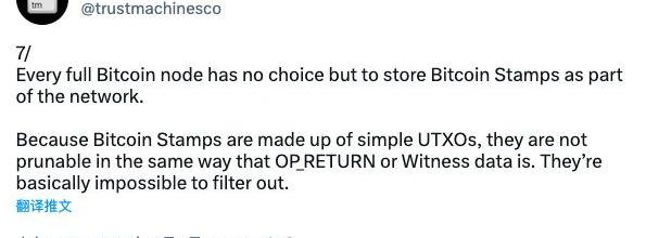 根據比特幣生態開發團隊TrustMachines的分析,BTCStamps相較于Ordinals最大的優勢在于,其數據保存基于最簡單的交易輸出完成,因此比特幣全節點們“別無選擇”,只能選擇去保存BTCStamps,而OP_RETURN和“見證數據”則存在被全節點“刪減”的可能性。