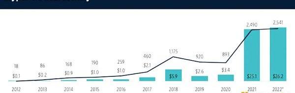 即使在2022年下半年出現了經濟衰退,2022年仍然是歷史上加密貨幣風險投資的最大年份,對公司進行了超過262億美元的新資本投資,相比之下,2021年投資額為251億美元。