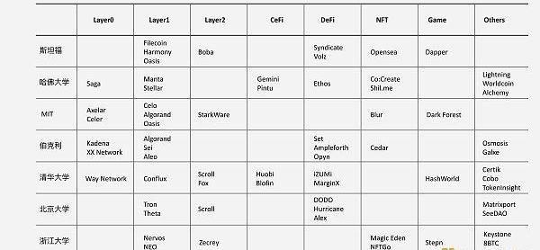可總有一些“弄潮兒”早早就洞悉了這場技術與金融變革并積極投身其中。典型案例是Meta(Facebook)出來創辦的Aptos、Sui;高通出來創辦的Solana;以紅杉資本、a16z為代表的投資機構自2021年開始已在Web3領域投資573億美元;全球頂級高校畢業的精英也加入這場“圈地運動”。根據Rootdata收錄的哈佛大學、斯坦福大學、加州大學伯克利分校、麻省理工學院、清華大學、北京大學、浙江大學校友創立的Web3項目數據庫,我按照各個主要細分賽道做了以下統計: