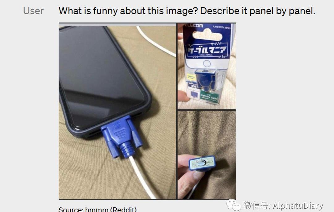 GPT-4能對相對復雜的圖像進行說明和解釋,比如說,從插入iPhone的圖片中識別出一個LightningCable適配器。
