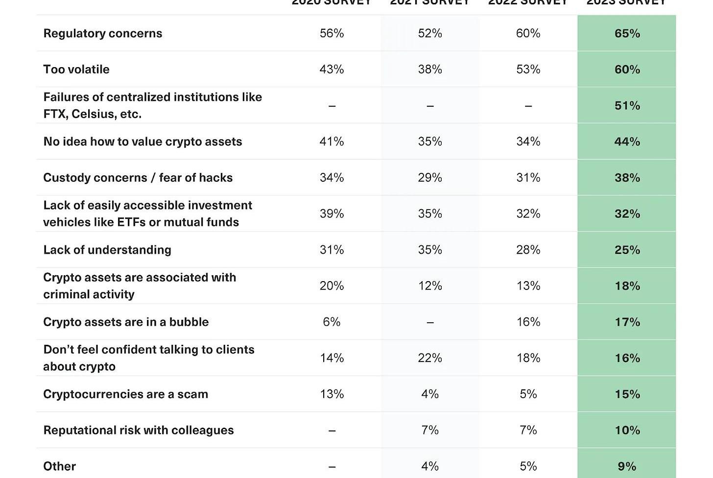 2022年,加密行業的主要痛點--公司倒閉,價格大幅波動,以及缺乏監管的清晰度--都清楚地反映了阻礙顧問啟動或增加其加密風險敞口的障礙。