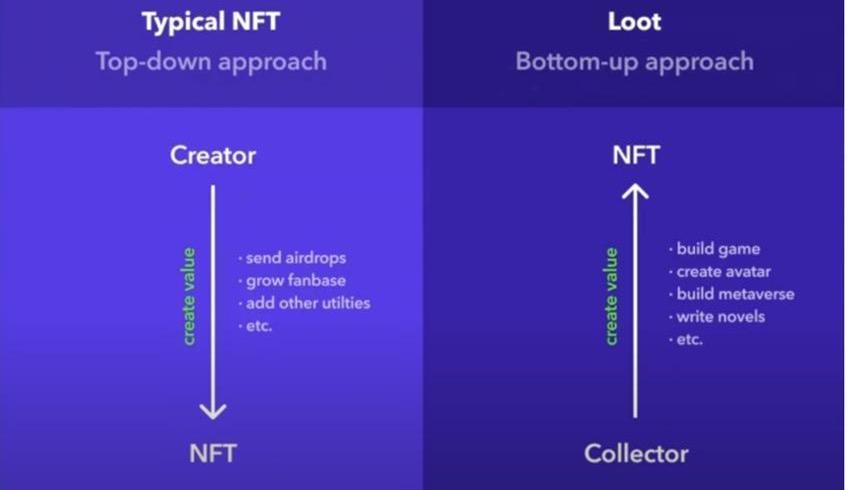 觀點二:游戲內經濟系統甚至物品的設計產出應當交由玩家,即純粹的去中心化市場經濟模式。這種模式在2021年9月的Loot生態中得到實踐并引發市場關注。不同于傳統Web3游戲項目,創作者設計創作NFT賣給收藏者,Loot收藏者也會參與到游戲生態的建設中。盡管Loot生態在后續的表現欠佳,但在2023年全鏈游戲進入視野時Loot又成為了人們的討論話題。(有意思的是,?2022年底大火的MAGIC平臺生態也是由2021年的Loot衍生出的項目)