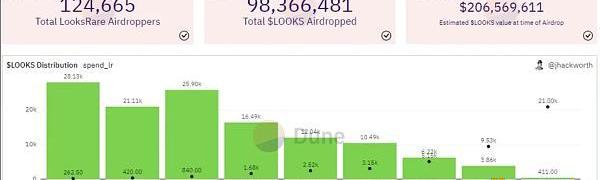 在交易的第一天,LOOKS代幣的價格約為2.1美元,估計空投總額為2.06億美元。幾周之內,LooksRare的代幣增加了180%,交易量從0增加到超過200億美元。