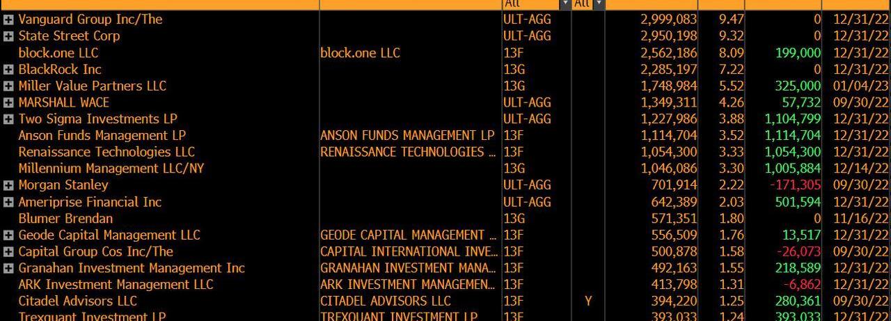 貝萊德更是早在上個月就表示,已增持Silvergate股份。一份文件顯示,截至12月31日,這家資產管理巨頭持有SilvergateCapital7.2%的股份,高于一年前報告的6.3%。2022年表現最好的安信基金也持有111萬股Silvergate,占該公司流通股的3.5%。科技投資者比爾·米勒、千禧基金、量化基金Renaissance、TwoSigma等也都加入做多行列,并持有Silvergate超過三分之一的股份。