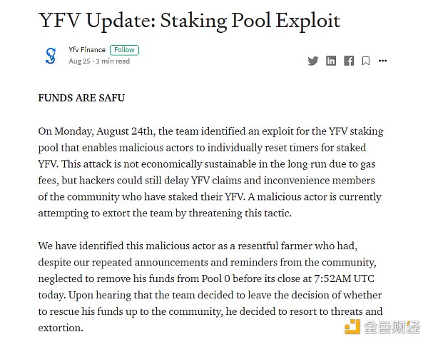 XRP/HKD+0.43%YFV是基于以太坊的一個DeFi項目,今天早些時候,YFV官方發文稱遭到勒索。攻擊者利用staking的合約漏洞,可以任意重置用戶鎖定的YFV。