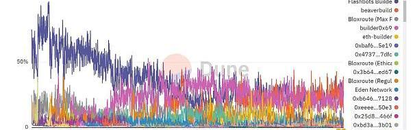 該圖說明了合并之前和之后一段時間內的出塊成功率。值得注意的是,可以看出Flashbots出塊成功率已經減少并達到與其他主要區塊構建者相似的平衡點,而不是完全主導區塊生產。這與提議中由于網絡效應導致的集中化相矛盾,這個結果可能有多種解釋。