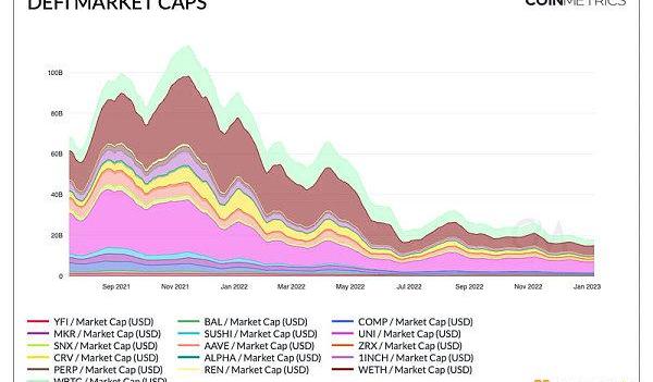 如下圖所示,DeFi代幣的總市值在過去幾個月經歷了顯著下降。這種下降可以歸因于多種因素,包括利率上升導致與有收益的DeFi產品的競爭、整體宏觀經濟不確定性和技術陳規陋習,以及最近在加密領域內的不當投資平倉。?