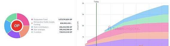 OPtimism是目前L2項目中唯一一個已經發幣的項目,自今年6月份上線至今,已解鎖了約23%的代幣,目前在以每天240萬OP的速度線性解鎖。從下面這token解鎖圖可以看出,OP的初始流通量很小,流通量小的盤面就比較容易被操控,有很多類似解鎖模型,項目方都是先控盤拉高價格開好空單,后續代幣高速增發價格下跌,項目方吃空單利潤賺一波,等代幣釋放完后,再看是否有第二輪敘事機會,所以大家還是要謹防風險。