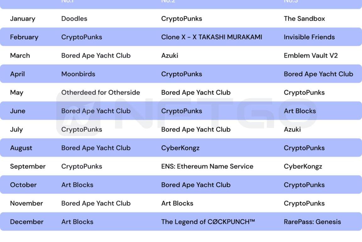 按出現頻率來看,CryptoPunks在表中共計出現10次,BoredApeYachtClub出現8次,ArtBlocks出現4次,它們平均出現在各個月份,是每個月巨鯨都會優先考慮買入的NFT。