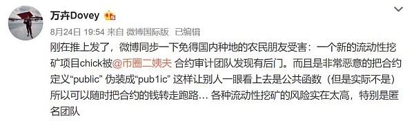 8月24日,“萬卉Dovey”在社交媒體上爆料稱,新的流動性挖礦項目chick被審計團隊發現留有合約后門,團隊可以隨時將合約中的資金轉走。