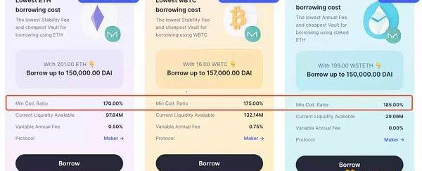 當用戶抵押的資產價值下跌,導致抵押率下降時,會觸發清算,用戶的抵押物被強制以溢價賣出,并需要支付13%的罰金。抵押物被清算后,用戶無需再償還DAI。