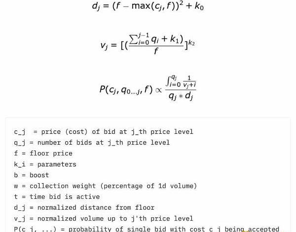 具體來說,Blur會根據NFT系列的24小時交易量對用戶的出價活動獎勵積分,在一個系列中,承擔最高風險的出價會獲得更多積分,也就是說,出價越接近地板價,出價持續時間越長,獲得的積分越多,當出價被NFT持有者接受時,該出價停止賺取積分。具體計算方式為: