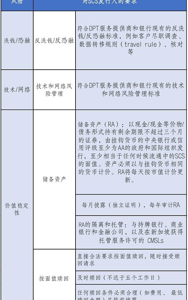 其中,對于非銀行發行人來說,必須獲得大型支付機構許可證,并受到新的披露和破產保護措施的約束。如受監管的DPT服務不超過MPI規模,SCS的發行人只需申請標準機構支付許可證;對于銀行發行人來說,因其本身就具有支付牌照,故而不需要在PSA下申請MPI或SPI牌照,也無需實施額外的準備金和審慎要求。銀行可以通過管理基礎儲備資產來發行SCS,使其與銀行的其他資產分離,SCS持有人只對這一特定的分離儲備資產池擁有索賠權。