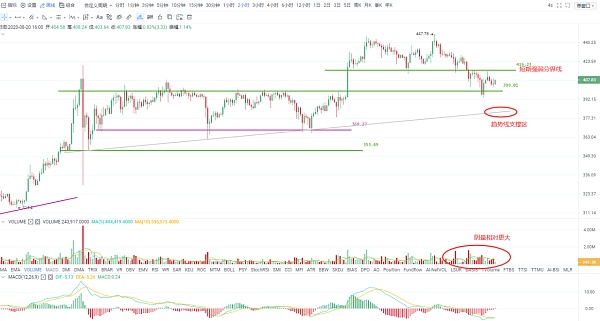 截圖來自OKEX ETH/USDT永續合約2小時圖:目前的客觀走勢及應對策略:ETH走勢也比較符合昨日預期,幣價下跌在短暫破位昨日所說399支撐后迎來短線反彈,反彈力度明顯強于BTC,這說明“強者恒強”依然在發揮作用。