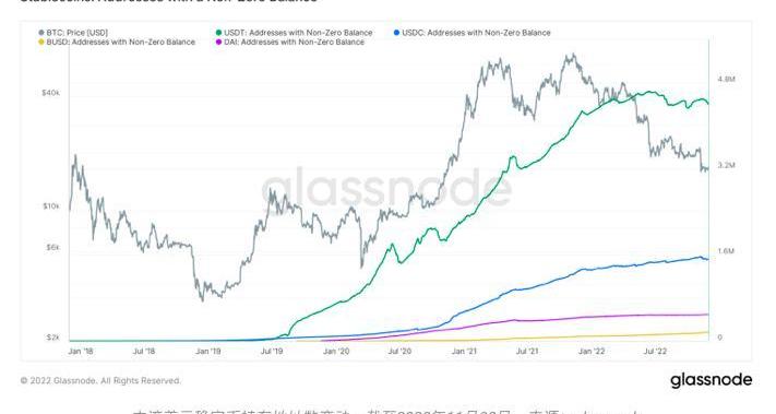 持有美元穩定幣的交易者數量也在不斷上升。截至?2022?年?11?月,穩定幣的持有地址數量已經輕松越過了?600?萬大關,與之相掛鉤的散戶與機構更是數不勝數。這些穩定幣被廣泛用于鏈上交易、現貨交易以及衍生品交易。加密投資者并未因為熊市而停下腳步。