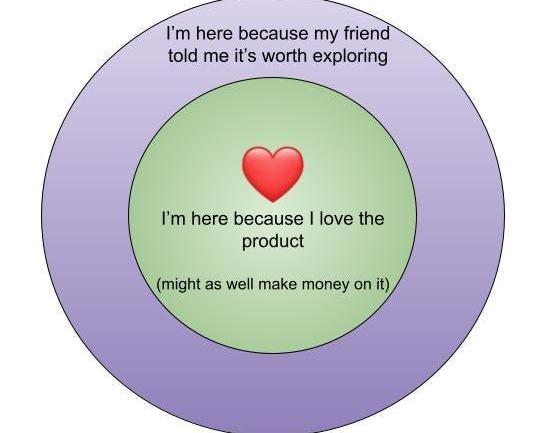 我們應該把重點放在圖中的核心區域,關注那些真心喜愛產品并樂于使用它們的人。其他社區參與者可能并沒有那么重要,因為他們大多單純是為了盈利。所以,我們最應該注重的肯定是那些「核心」參與者。