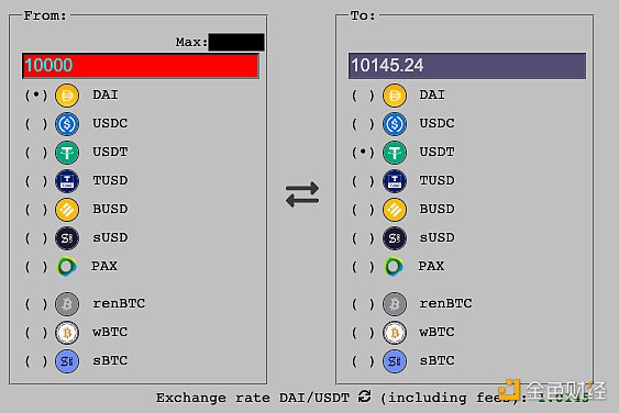 Curve再次提供了最佳匯率,因為它包含了市場價格,而不是一對一的掛鉤價。如果我們將資產從USDT轉移到DAI,Curve將10000 USDT兌換為大約9991 DAI,而mStable將10000 USDT兌得9990 DAI。
