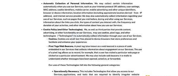 文件顯示:「當您使用我們的服務時,我們可能會自動收集某些信息,例如您的IP地址、用戶設置、MAC地址、cookie標識符、移動運營商、移動廣告和其他唯一標識符瀏覽器或設備信息、位置信息以及互聯網服務提供商。我們還可能會自動收集有關您使用我們服務的信息,例如您在使用我們服務之前、之后訪問的頁面、您點擊的鏈接信息、您互動的內容類型、您活動的頻率和持續時間,以及有關您如何使用我們服務的其他信息。」