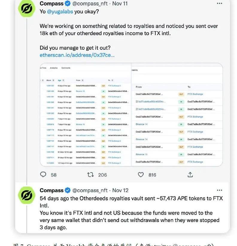 隨后不巧的是,NFT平臺Compass發推稱,YugaLabs有?1.8?萬枚ETH5.7473?萬個APE在FTX平臺上存放,并公布了其哈希交易記錄,對上述yugalabs聯合創始人的發言進行了質疑。