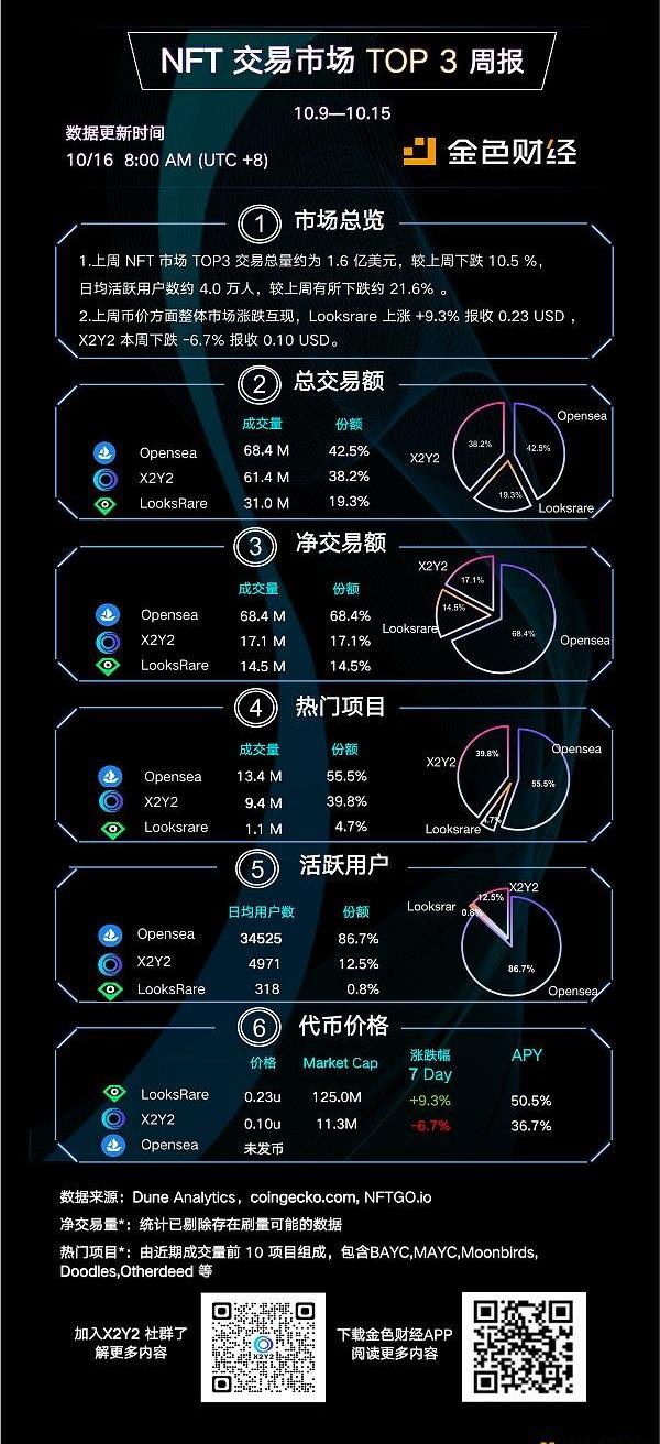 1、上周NFT市場成交量有所回落,較上周下降約-10.5%;其中X2Y2周成交額占比38.2%。