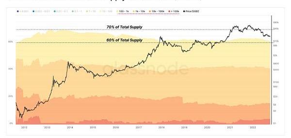 大型實體的重要性可以通過計算它們的持倉量在比特幣總流通量中的占比來衡量。正如下面的相對地址持幣分布圖所示,自2011年初以來,大型實體地址持倉量在總量中的份額從70%逐漸下降至60%。