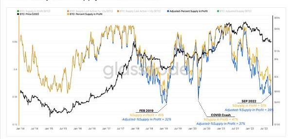 通過使用這個不活躍的獲利比特幣調整獲利比特幣?,我們可以計算出調整后的獲利比特幣占比?。結果圖表顯示,在熊市周期的最低點,獲利比特幣占比往往會下降到39%左右。但在越早的熊市周期中,獲利比特幣占比會下降的越厲害。