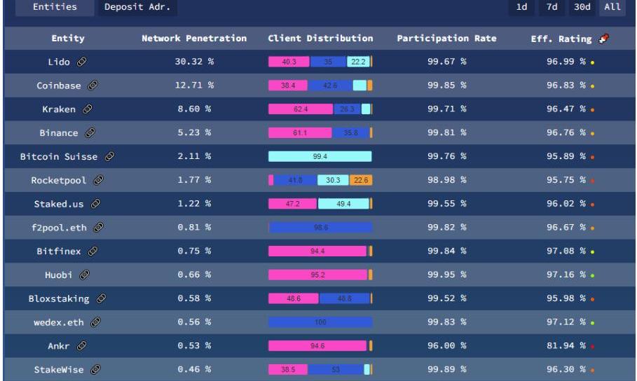 自合并以來,前兩名質押服務商合計持有43.03%的份額,前三名持有51.63%的份額。這里的風險在于,如果Lido和Coinbase聯合起來,可以使網絡停止運行;如果Kraken也加入,那么三者將可以接管以太坊網絡。