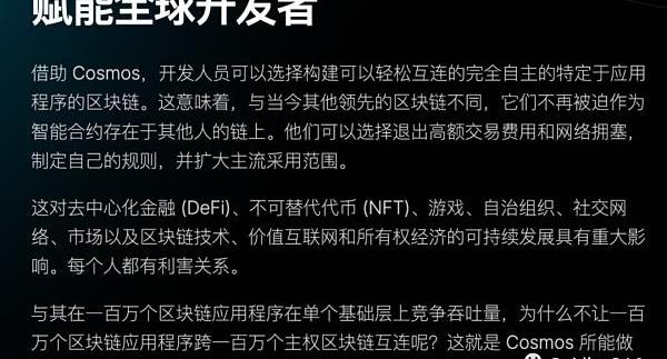 Cosmos的目標是成為區塊鏈的互聯網,首先它提供了一套“發鏈”能力,讓每個社區都可以擁有一條自己的主權鏈,主權鏈即獨立的區塊鏈,數據的產生和寫入都是內部閉環的,其次鏈之間可以進行數據通信交互,實現萬鏈互聯,這個愿景還是非常有感召力的。