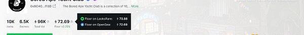 通常各個NFT平臺的地板價都因為平臺上掛出的具體NFT而有所不同。比如下方截圖中,LooksRare上掛出的BAYC系列地板價是73.88ETH。不過我們也可以看到LooksRare對比了Opensea的地板價,而Opensea的地板價實際上是72.69ETH。因此要更加準確地計算NFT地板價,就必須從多個平臺搜尋價格,并考慮市場分化因素。
