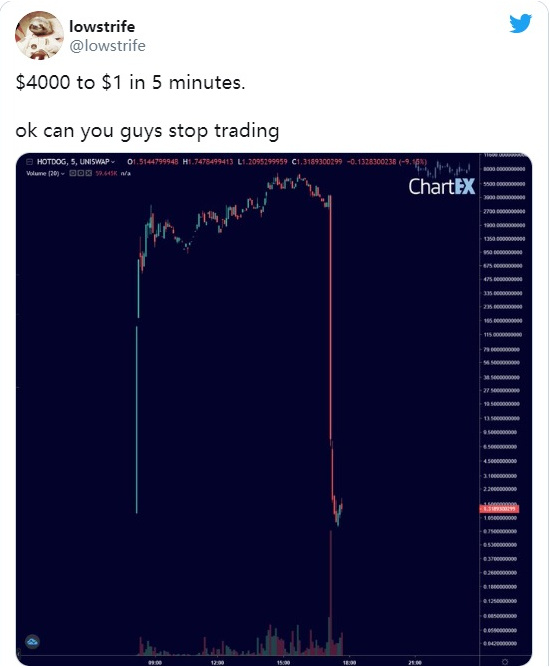 如上圖,其代幣HOTDOG價格先是在上線后的7小時內飆升至6200美元以上,又用了不到3小時跌至目前的0.017美元。據推特網友lowstrife,HOTDOG從4000美元跌至1美元,用時不到5分鐘。