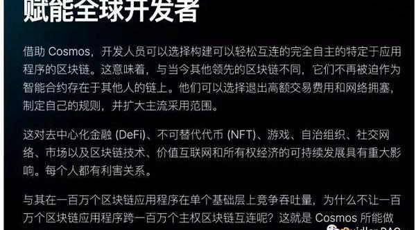 Cosmos的目標是成為區塊鏈的互聯網,首先它提供了一套「發鏈」能力,讓每個社區都可以擁有一條自己的主權鏈,主權鏈即獨立的區塊鏈,數據的產生和寫入都是內部閉環的,其次鏈之間可以進行數據通信交互,實現萬鏈互聯,這個愿景還是非常有感召力的。
