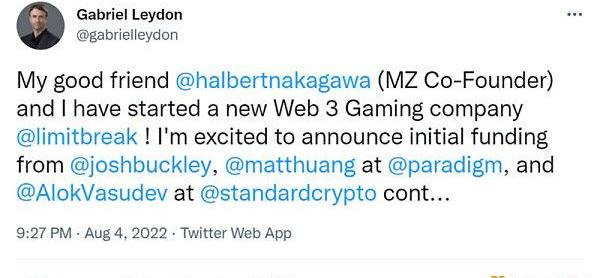 1998年就讀于加州大學伯克利分校,計算機專業,43歲。他和GabrielLeydon從GlobalVR開始共事,在2008年一起創立了MachineZone公司,現在又作為聯創一起創立了LimitBreak。Halbertnakagawa和Leydon共事多年,雙方配合應該是非常不錯的。其推特是今年3月才剛注冊的,為人較為低調,過往幾乎沒有太多信息披露。
