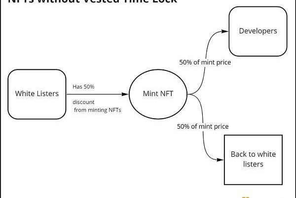 例如,一個NFT需要1個ETH,該項目為支持該項目的白名單用戶提供50%的折扣。在這些白名單用戶Mint了NFT后,所述的NFT將進入鎖倉合約,在初始鎖定時將向開發者發放0.5ETH。然后,白名單用戶必須等待斷崖鎖倉期結束。