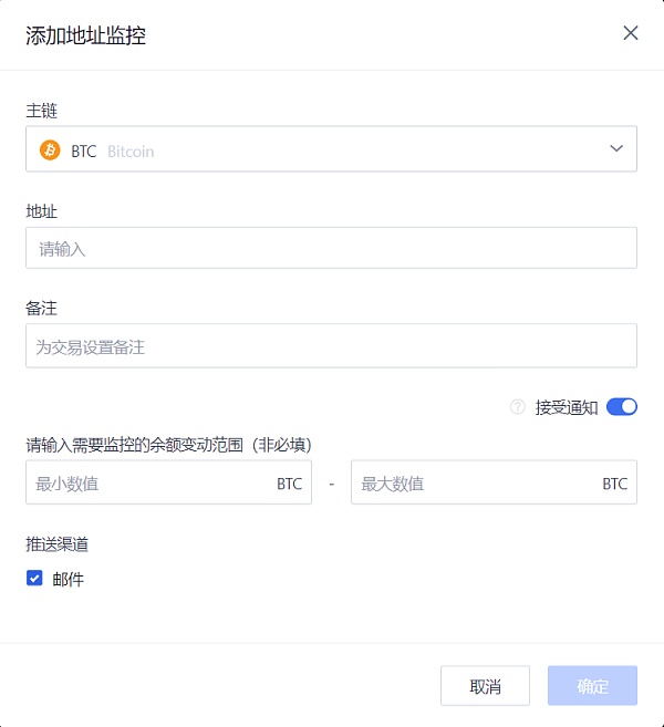 將需要監控的地址或交易添加到“鏈上監控”的列表中,設定好余額變動范圍,就可以在資金發生轉賬時獲取到第一時間的郵件通知,免除人肉持續監控的煩惱。