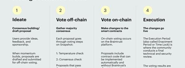 除了用于招聘環節的激勵獎勵外,還被用于社區的治理。BTRST的持有者可以提出改進的想法并對治理建議進行投票,擁有更多代幣的用戶也就擁有更多的投票權。與其他的投票模式不同,Braintrust的治理分為鏈上和鏈下兩部分。