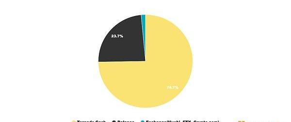 根據典型安全事件ETH資金流向圖,74.6%洗錢資金流向Tornado.Cash,資金量高達300,160ETH;23.7%洗錢資金保留在黑客地址,暫未進一步轉移,資金量為95,570ETH;1.5%洗錢資金流向交易平臺,資金量為6,250ETH。