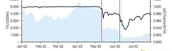 從5月份開始的市場動蕩事件迫使大型市場參與者,尤其是Celsius和ThreeArrowsCapital,出售他們的stETH抵押品。stETH-ETH流動性的缺乏和擁擠的杠桿交易導致很多人試圖通過一扇小門退出。