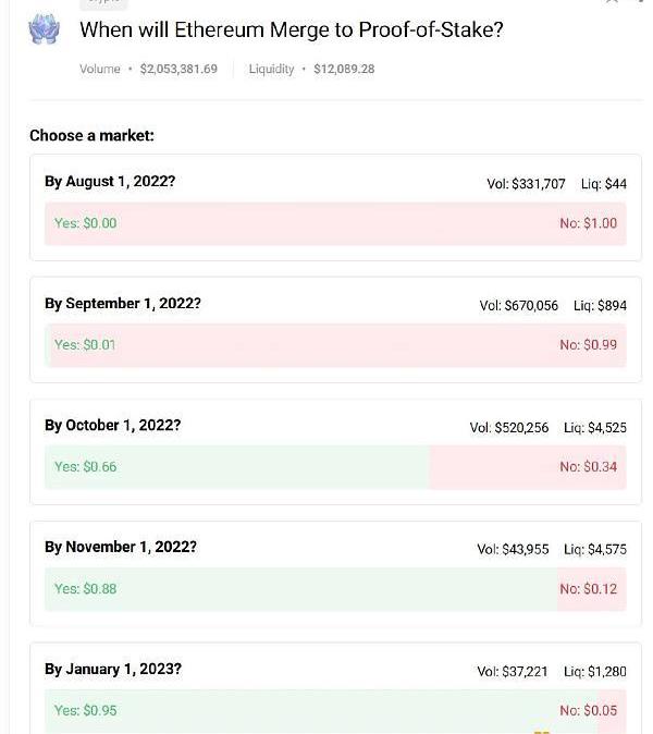 Polymarket擁有最大的合并預測市場。盡管流動性低得令人難以置信,削弱了它的預測能力,但它提供了另一種更簡單的方式來衡量市場對合并的情緒。
