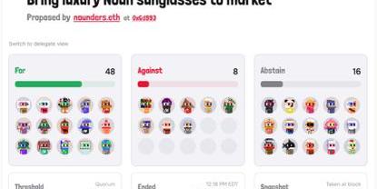 一個著名的例子是NounsVision,基于Nouns標志性眼鏡的豪華實體太陽鏡。2月,salvinoarmati提議制作一個太陽鏡的原型,DAO授予他5個ETH。4月,原型制作完成,DAO成員nounders提議授予7.2%的國庫,將500副推向市場,提供給前500名Nouns持有人。48位成員投了贊成票,8位投了反對票,提案通過。