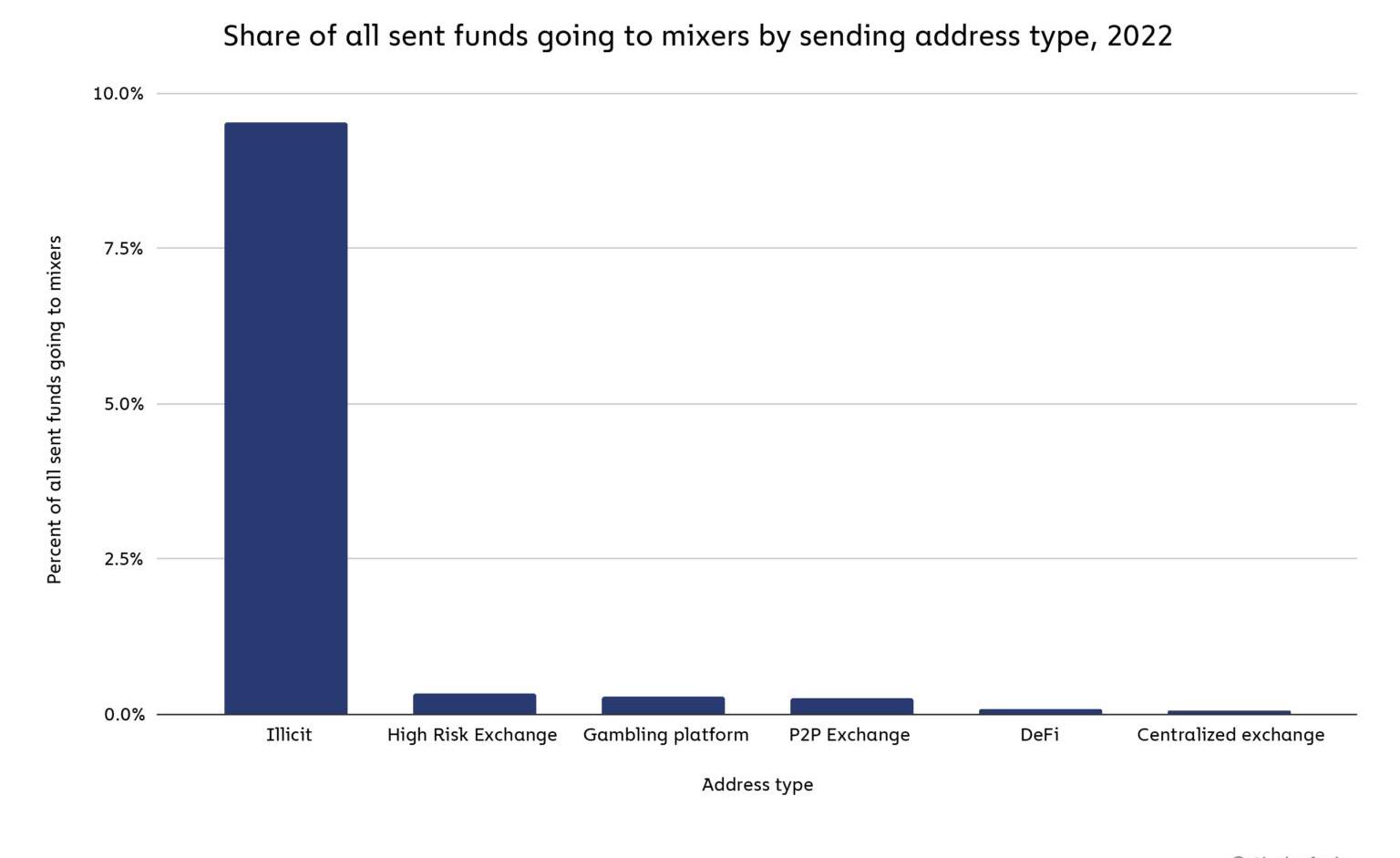 必須承認,混幣器的核心定位和功能,以及其很少要求KYC的特性,使它們自然而然地成為了網絡罪犯的首選。根據Chainalysis的數據顯示,從非法地址發送的資金中,有近10%是被轉到了TornadoCash這樣的混幣器中,而轉到中心化交易平臺、DeFi這些「主流基建」的資金甚至都沒有超過0.5%。
