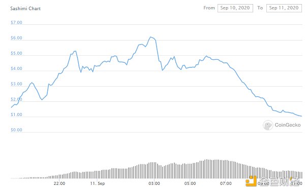 SASHIMI代幣因為上線不久,波動較大。據coingecko數據,截止發稿SASHIMI代幣報1.04美元,9月11日凌晨價格一度達到6.2美元。
