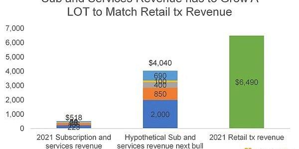 綜上,你會發現即便在最樂觀情況下,Coinbase可以獲得總計約40億美元的訂閱和服務收入,遠低于Coinbase在2021年獲得的65億美元零售交易收入,而且我們還沒有考慮Coinbase需要面臨來自Binance和FTX日益殘酷的市場競爭。